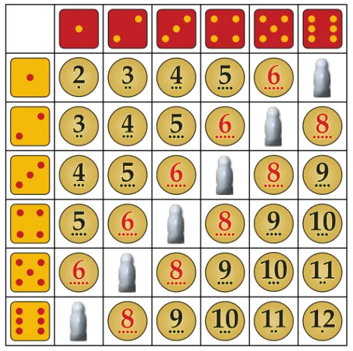 En este caso, tomamos nota de las ubicaciones que tengan mejor producción. Se calcula con las 2 o 3 losetas alredor del pueblo a fundar. Debido a la forma que se distribuyen los numeros en el armado (y dependiendo también de la ubicacion al azar del desierto) hay ciertos patrones de lugares con mas produccion que suelen aparecer comunmente. 5-9-10, 6-9-3 , 8-5-10, etc. Cada numero tiene un tamaño o numero de puntos que representan las probabilidades del resultado de tirar el par de dados. La regla general, los numeros mas cercanos al 7 son mejores, que es el numero que mas probabilidades de salir tiene.